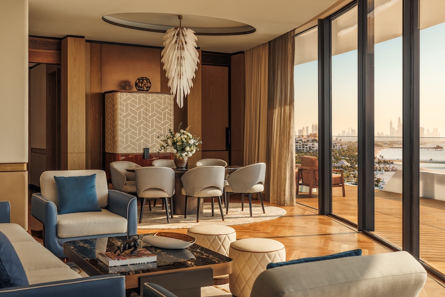 Guestrooms channel the sleek lines of Italian Riva boats, each opening onto expansive private terraces with uninterrupted views of the Arabian Gulf.