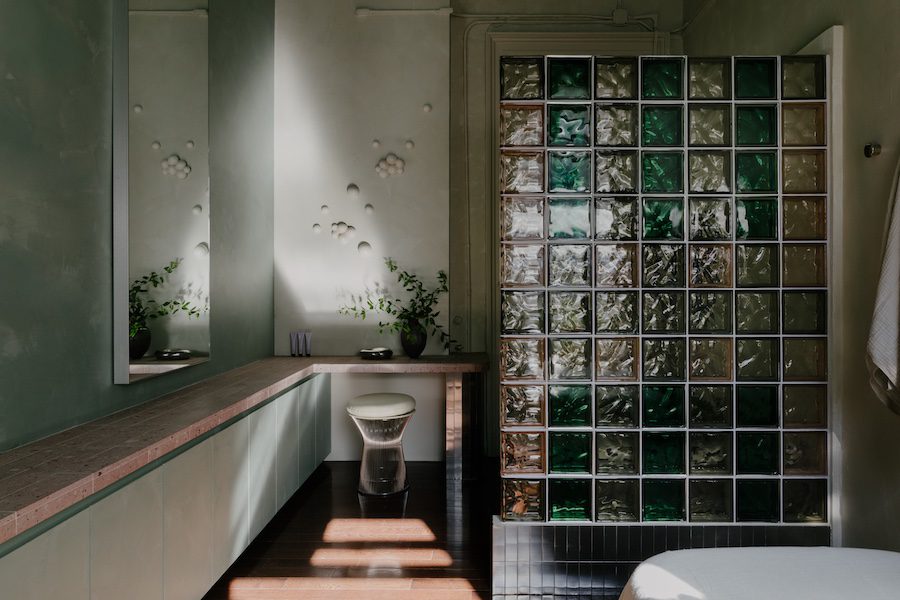 A palette of muted blue-greens, warm neutrals, and volcanic Cantera stone in a pink-purple hue creates a calming yet modern aesthetic. Reflective glass bricks and chrome accents echo water’s fluidity, inspired by the intricate natural materials seen in Moroccan architecture, as well as Peter Zumthor’s Therme Vals spa.
