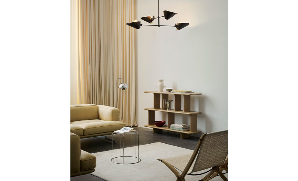 The outline of the Bonnet chandelier from Space Copenhagen for &Tradition appears as if it’s drawn in a single pencil stroke, while its curved shades envelope the light source and can rotate up to 180 degrees.