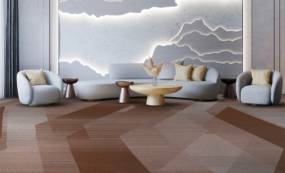 The Mystic Horizons broadloom collection, a collaboration from Stacy Garcia Design Studio and Signature Flooring crafted using AI, blends natural landscapes and frequency vibrations with algorithmic creativity to achieve ethereal, performance-driven patterns for lobbies or corridors.
