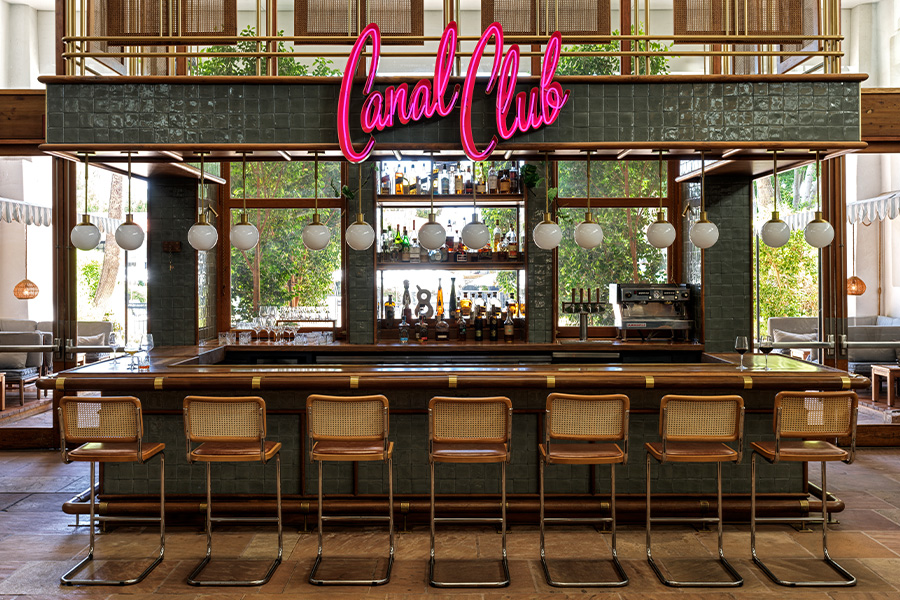 The bar at the Canal Club at the Scott Resort & Spa in Scottsdale, designed by AvroKO, channels Havana