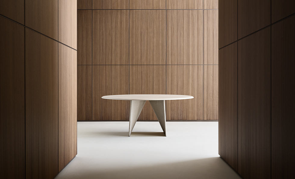 The sculptural Lambda, from Rimadesio‘s Modernity Flow line by Giuseppe Bavuso, strikes a balance between visual lightness and structural solidity. Available with a round and elliptical top, the table is reminiscent of the Greek letter from which it takes its name thanks to a base comprising two rectilinear pieces bending upwards to converge in the center.