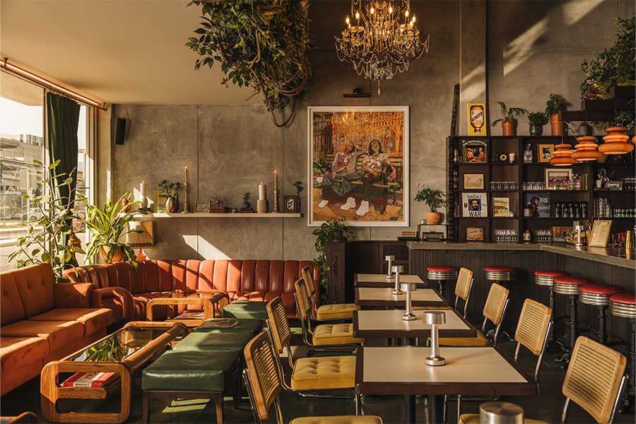 Casual Jamaican restaurant JRK! and speakeasy-style bar Mangrove are two distinct concepts expertly integrated under one roof. Fusing both flavors and ambiance, the 2,518-square-foot multifunctional space marries laid-back dining and sophisticated lounging in a nod to the richness and vibrancy of Jamaican culture. Patinaed materials and exposed concrete walls create a lived-in feel, while yellow and green tones—the restaurant’s brand colors—mingle with orange accents. “The space exudes an eclectic charm, seamlessly blending midcentury-modern elements that evoke the nostalgic allure of the 1960s and ‘70s,” says Andreas De Camps and Olivia King, the cofounders of hospitality firm FictionWorks, which collaborated with Studio Andreas De Camps on the project.