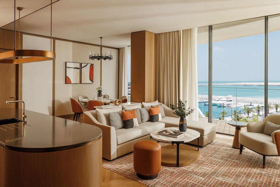 Jumeirah Residences Marsa Al Arab offers 82 one- to three-bedroom units with sweeping marina or ocean views and exclusive access to private amenities.
