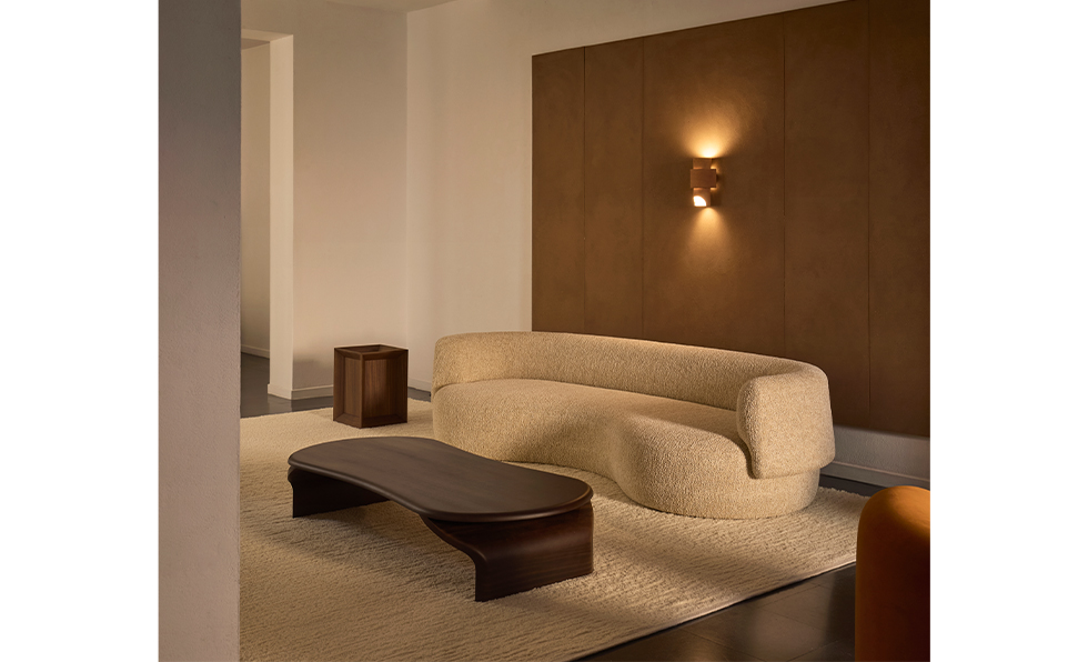 Collection Particulière presents Velouria, a line of sleek furniture and accessories that includes the FAO sofa, MIU low table, ELP sconce by Christophe Delcourt, and the B-SIDE table by Grégoire de Lafforest.